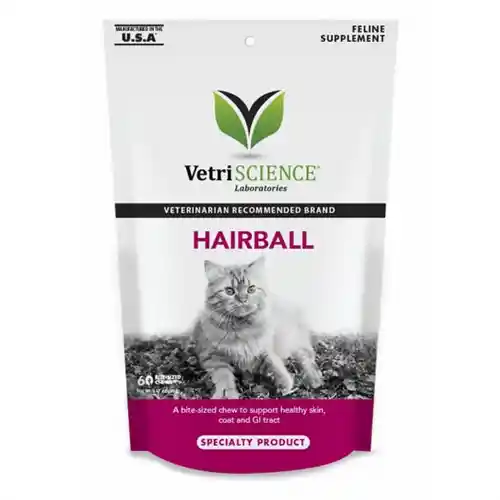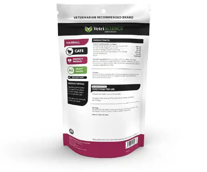 Hairball supplement can help prevent and eliminate hairballs by supporting skin health and normal shedding. Veterinarian formulated without mineral oil or herbals, Hairball features omega 3 and 6 fatty acids to help minimize hairball formation by supporting skin hydration, resiliency and healthy shedding. Biotin is needed for healthy skin and normal shedding. Zinc is involved in keratin and collagen production, which are key factors for skin health. Cranberry powder supports urinary tract health. Hairball is not a laxative or lubricant, which can disrupt feline digestion. Even picky eaters love these delicious chicken liver-flavored chews made with naturally sourced ingredients.