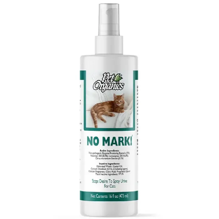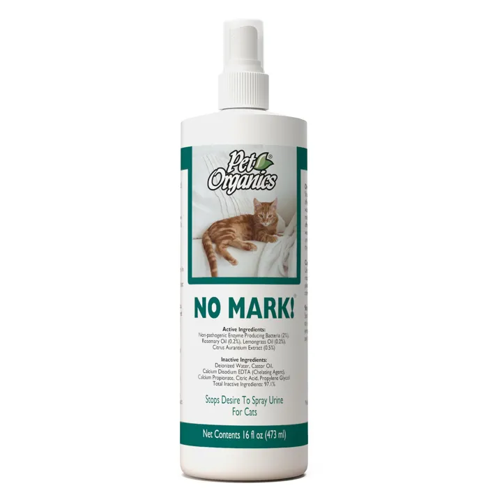 *A behavior modification spray to end urine marking safely.*If your cat has urine-marked on an indoor surface, use the easy to follow directions to help eliminate your cat’s impulse to re-mark. Pet Organics NO MARK!® works great on indoor plants and Christmas trees too!NO MARK! is not a deterrent. However, the simulated pheromones in NO MARK! tend to help create a comforting, reassuring feeling in the cat that has a calming effect. Most cats seem to feel less anxious, more content, friendly, gentle, and thus less desirous of re-spraying. The simulated pheromones have no foul odors and will not affect any surface that water will not harm.• Less anxious• More content• Friendly• Gentle*Cautions:* Do not spray on pets. Use only as directed. Keep out of the reach of children. If ingested, drink plenty of water, induce vomiting, and consult a physician.*Storage and Disposal:* Store in a cool, dry place inaccessible to children and pets. Do not reuse empty container. Wrap in newspaper and discard in trash.*Directions:* Shake well before using. Clean affected surfaces with alcohol or water only. When the surfaces dry, mist-spray No Mark! on affected surfaces twice daily for one week. Then once daily, as needed. If urine-marking should re-occur, just repeat the above procedure.