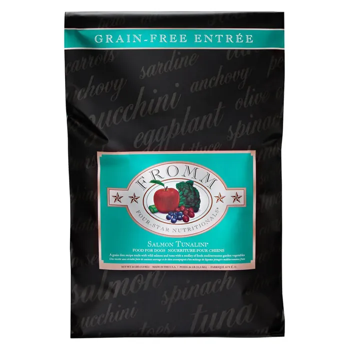 Keeping the needs of your dog in mind, Fromm Four Star Grain Free Salmon Tunalini Dry Dog Food is made to support the all breeds in all stages of life. Made with high amounts of protein and paired with fresh produce including potatoes and peas to provide high quality, easily digestible carbohydrates. Fromm Four Star Grain Free Salmon Tunalini Dry Dog Food provides well rounded, balanced nutrition for your furry friend without the unnecessary fillers! This recipe also supports the health of your dog‰ۡó»s coat and skin with guaranteed levels of Omega fatty acids and is enhanced with probiotics to ensure that their digestion is right on track! Fromm Four Star Grain Free Salmon Tunalini Dry Dog Food is grain free and made with quality ingredients found in the United States with no artificial colors, flavors, or preservatives that any pup is sure to love!