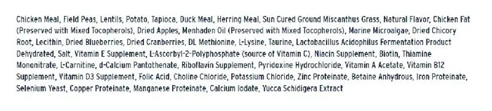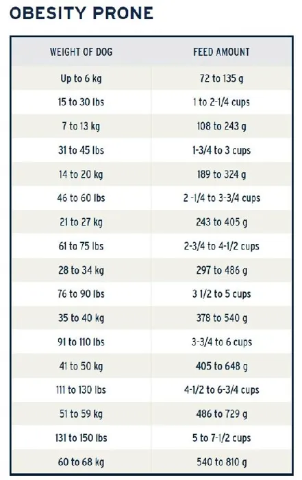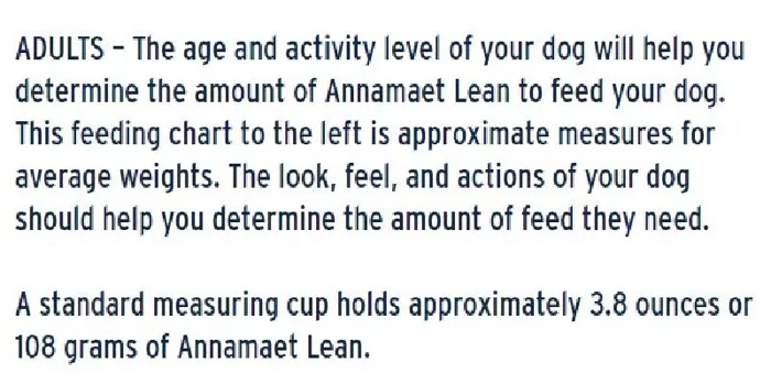 Chicken Meal, Field Peas, Chickpeas, Potato, Tapioca, Duck Meal, Herring Meal, Natural Flavor, Chicken Fat (Preserved with Mixed Tocopherols (Vitamin E)), Menhaden Oil (Preserved with Mixed Tocopherols (Vitamin E)), Carrots, Celery, Parsley, Lettuce, Watercress, Spinach, Fat Product (Algae, Source of Fatty Acids), Lecithin, DL Methionine, L-Lysine, Cranberries, Lactobacillus Acidophilus Fermentation Product Dehydrated, Oligofructose, Yucca Schidigera Extract, Salt, Kelp Meal, Vitamin E Supplement, L-Ascorbyl-2-Polyphosphate (source of Vitamin C), Niacin Supplement, Biotin, Thiamine Mononitrate, L-Carnitine, d-Calcium Pantothenate, Riboflavin Supplement, Pyridoxine Hydrochloride, Vitamin A Acetate, Vitamin B12 Supplement, Vitamin D3 Supplement, Folic Acid, Choline Chloride, Potassium Chloride, Zinc Proteinate, Betaine Anhydrous, Iron Proteinate, Selenium Yeast, Copper Proteinate, Manganese Proteinate, Calcium Iodate. Feeding Instructions: CALORIE CONTENT Metabolizable Energy, as fed, 3242 kcal/kg = 1474 kcal/lb = 350 kcal/cup A STANDARD MEASURING CUP HOLDS 3.8 OUNCES OR 108 GRAMS OF ANNAMAET GRAIN FREE LEAN. WEIGHT OF DOG (lbs./kg) FEED AMOUNTS (cups/grams) FEED AMOUNTS (cups/grams) NORMAL ACTIVITY OBESITY PRONE Up to 14 lbs 1/2 to 1-3/4 cups 2/3 to 1-1/4 cups 15 to 30 lbs 1-1/2 to 3 cups 1 to 2-1/4 cups 31 to 45 lbs 2-1/2 to 4 cups 1-3/4 to 3 cups 46 to 60 lbs 3-1/4 to 5 cups 2 -1/4 to 3-3/4 cups 61 to 75 lbs 4 to 5-1/2 cups 2-3/4 to 4-1/2 cups 76 to 90 lbs 5 to 6-1/2 cups 3 1/2 to 5 cups 91 to 110 lbs 5-1/2 to 7-1/2 cups 3-3/4 to 6 cups 111 to 130 lbs 6-1/2 to 8-1/2 cups 4-1/2 to 6-3/4 cups 131 to 150 lbs 7 to 9-1/2 cups 5 to 7-1/2 cups