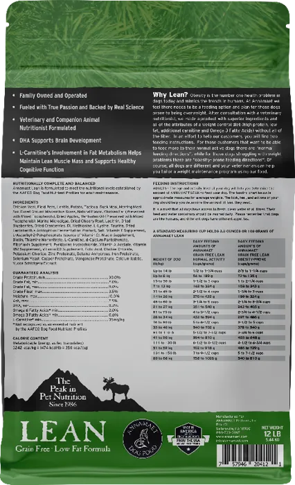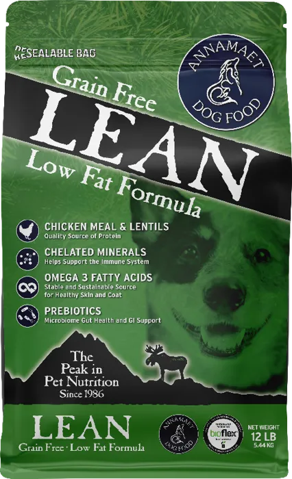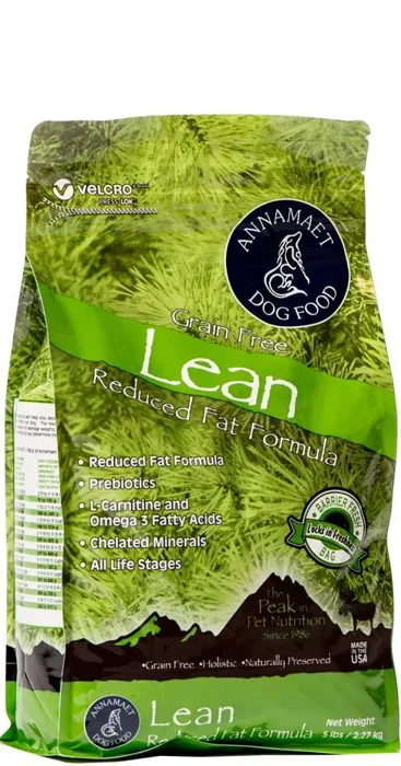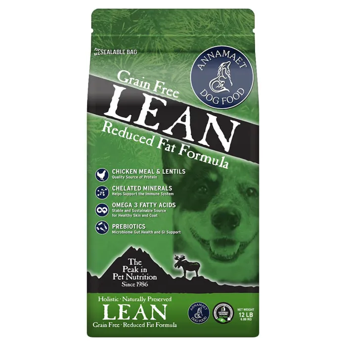 AnnamaetåÊlean formula has half the fat of our other grain free products. In addition to helping dogs with weight concerns, this formula will also work well for large breed puppies and dogs with pancreatitis. Annamaet Lean is formulated to meet the nutritional levels established by the AAFCO dog food nutrient profiles for "ALL LIFE STAGES" (Gestation, Lactation, Growth and Maintenance).