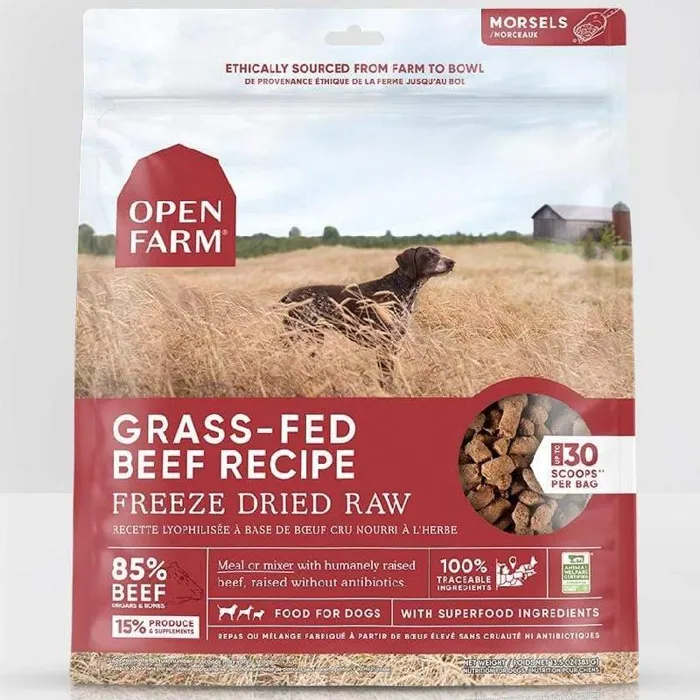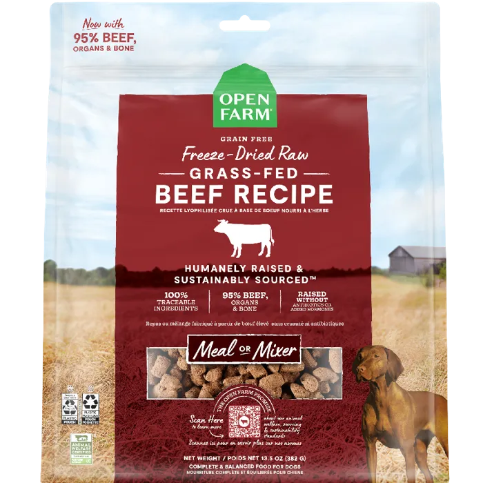 Easy to serve and easy to please. This high protein topper or complete meal is packed with humanely raised 100% grass-fed beef. For added nutritionåÊOpen FarmåÊincludes functional ingredients like locally sourced leafy greens, squash and pumpkin seeds, superfoods like coconut oil, and antioxidants like blueberries.