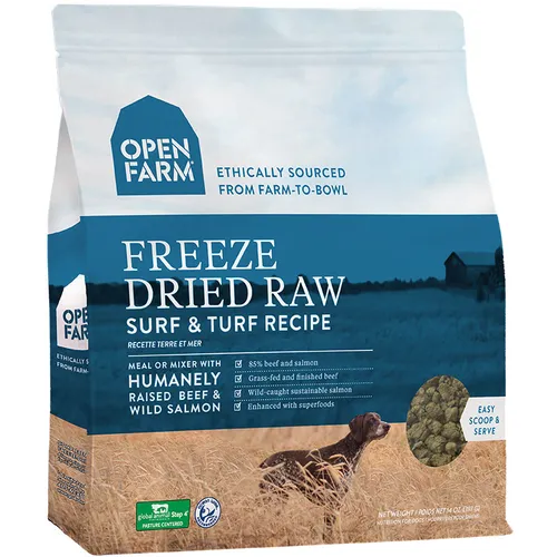 Easy to serve and hard to resist. This high protein topper or complete meal is packed with humanely raised grass-fed beef and wild-caught Pacific salmon. For added nutrition Open Farm includes functional ingredients like locally sourced leafy greens, squash and pumpkin seeds, superfoods like coconut oil, and antioxidants like blueberries.